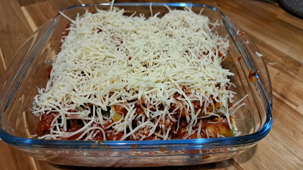 - Verser un filet d’huile d’olive dans un plat allant au four. Verser une première couche de la sauce tomate. Puis, déposer une première couche de cannelloni farcies, une couche de sauce tomate. Répéter cette étape jusqu’à ce qu’il n’y ait plus de cannelloni. Finir en répartissant l’emmental râpé.