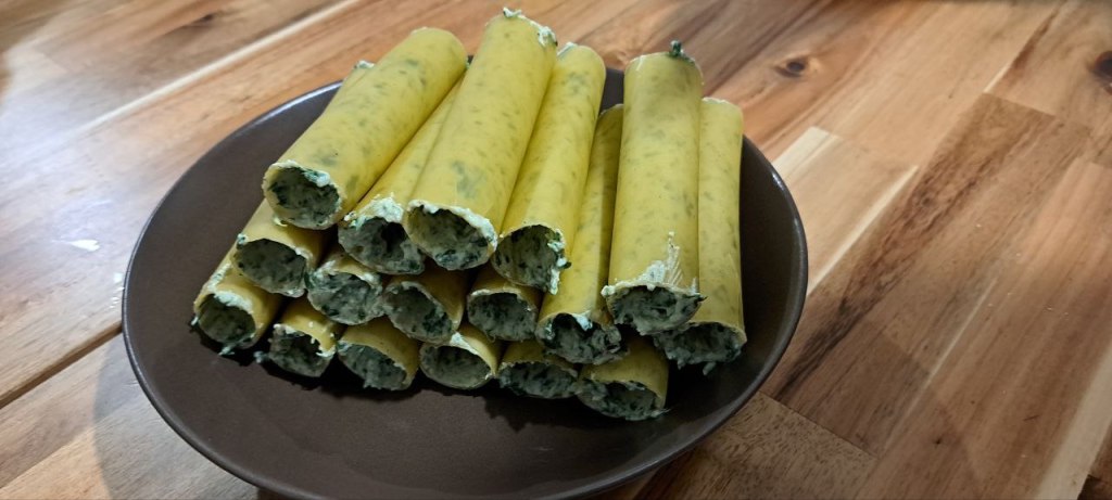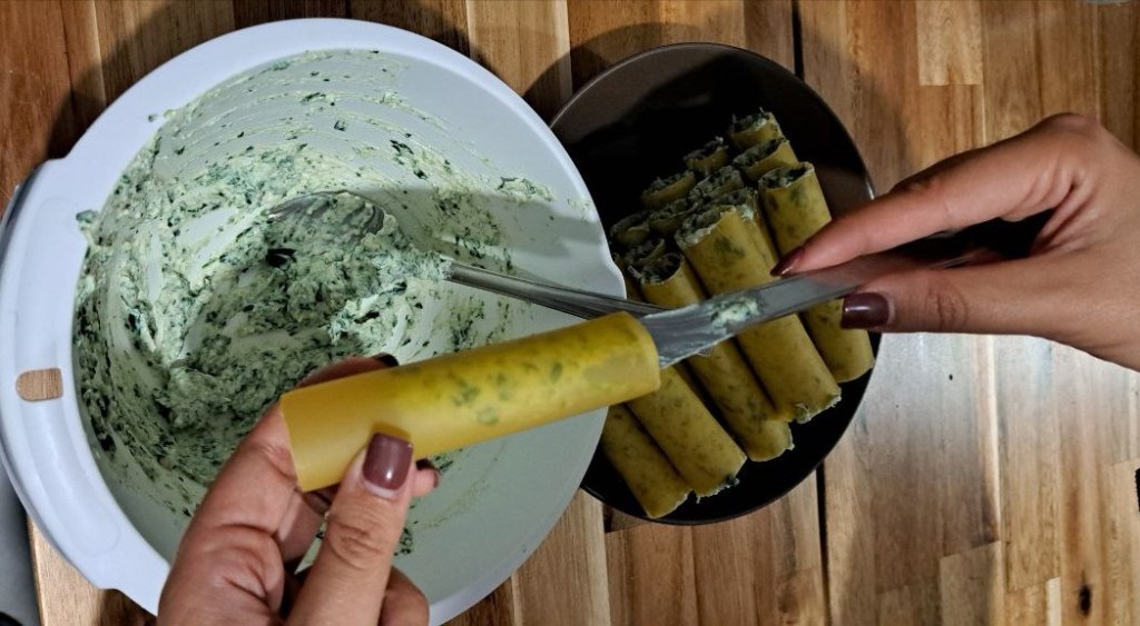 - En parallèle, farcir à l’aide d’un couteau chaque cannelloni de la préparation ricotta-épinards-parmesan.