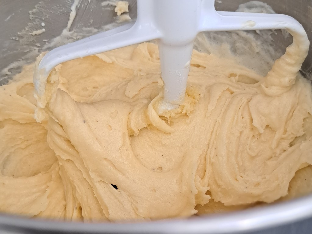 - Mélanger, avec la feuille du robot ou avec une cuillère en bois, le beurre pommade avec le sucre et la vanille.