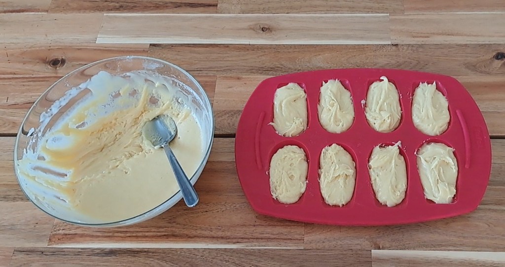 - Répartir la pâte dans le moule à madeleines (en plusieurs fois en plusieurs fois selon le moule).