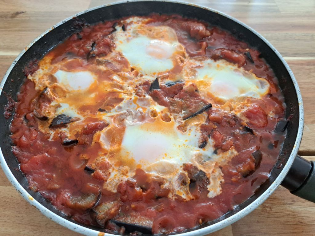 Aujourd’hui je vous propose une recette d’un plat tunisien, la Chakchouka. C’est une sorte de poêlée de légumes tels que des poivrons, des tomates et oignons, avec des épices et à laquelle s’ajoutent à la fin des œufs. Ici je vous propose le plat avec des aubergines, un de mes légumes préférés. J’aime bien épicer mes plats mais bien évidemment libre à vous d’épicer selon vos goûts.