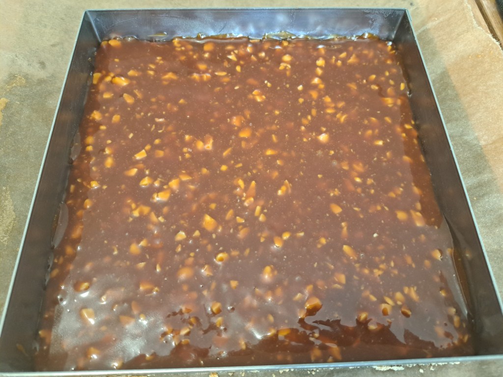 - Couler le caramel beurre salé chaud sur le biscuit froid dans son moule. Etaler un peu à l’aide d’une cuillère et tapoter si nécessaire pour égaliser.