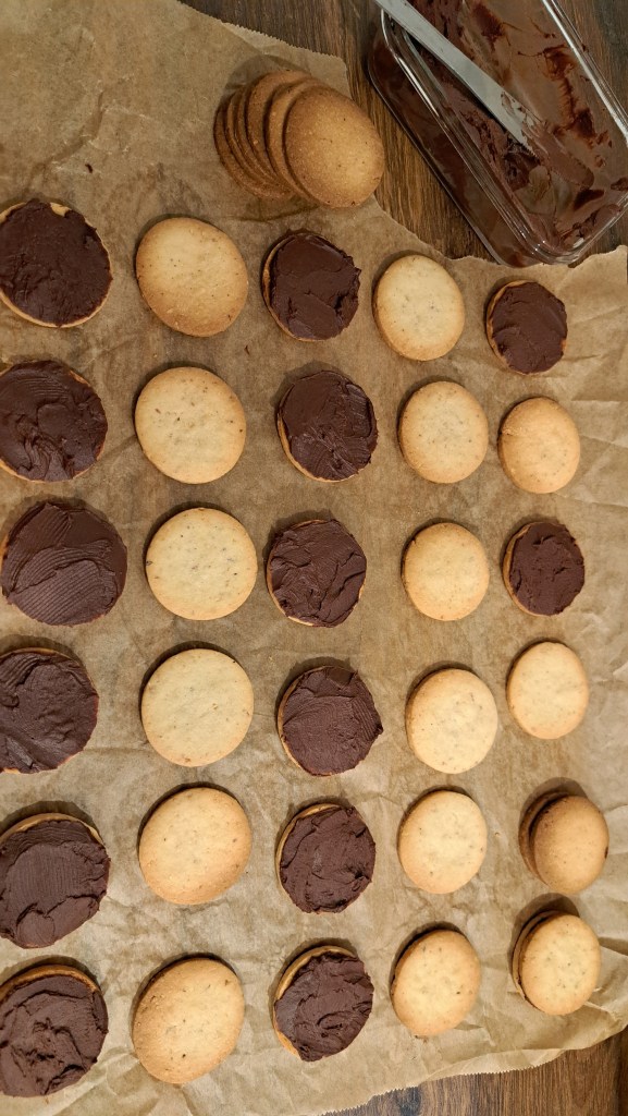 - A l’aide d’un couteau, étaler une généreuse couche de ganache sur la moitié des biscuits puis assembler avec les biscuits restants.